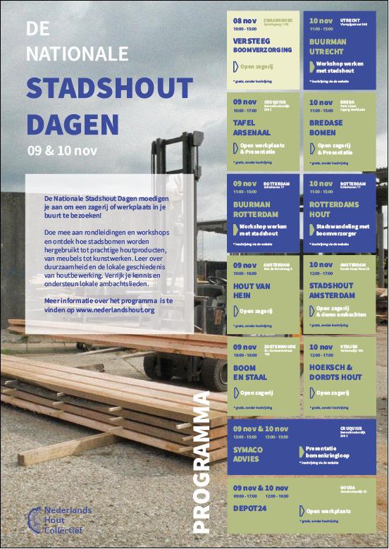 Op zaterdag 9 en zondag 10 november neemt Depot24 deel aan de Nationale Stadshoutdagen op de creatieve broedplaats GOUDasfalt! Tijdens deze dagen laten wij de verschillende houtsoorten zien die wij gebruiken en de prachtige producten die wij hier van maken.