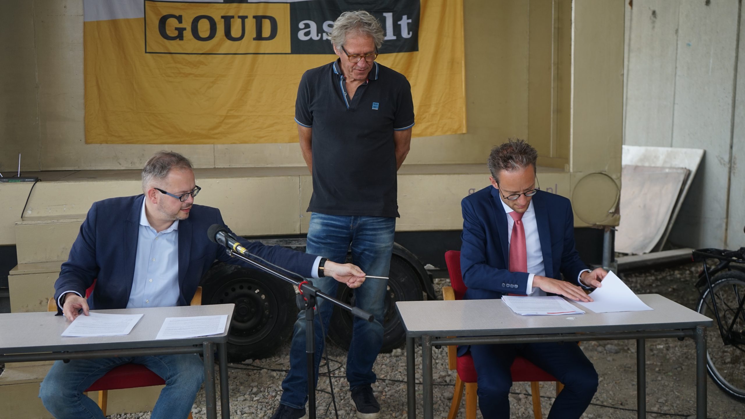 “Burgerinitiatief GOUDasfalt is sinds 2016 betrokken bij het terrein aan de Gouderaksedijk”, zegt Wethouder Thierry van Vugt. “Het terrein biedt vele mogelijkheden en veel Gouwenaars weten GOUDasfalt inmiddels te vinden. Voor een bezoek aan het stadsstrand, diverse maatschappelijke activiteiten of kleine ondernemingen of voor een van de vele evenementen die er plaatsvinden op het terrein. Het afsluiten van een erfpachtovereenkomst is een logische stap na de afronding van het kaderstellend ambitiedocument voor het terrein eerder dit jaar. De erfpachtovereenkomst stelt GOUDasfalt in de gelegenheid om voor langere tijd over het terrein te kunnen beschikken. Op deze manier is het voor GOUDasfalt ook eenvoudiger om nieuwe samenwerkingsrelaties aan te gaan en partijen voor langere tijd aan zich te binden. Het college wenst de stichting veel succes met de verdere doorontwikkeling.”