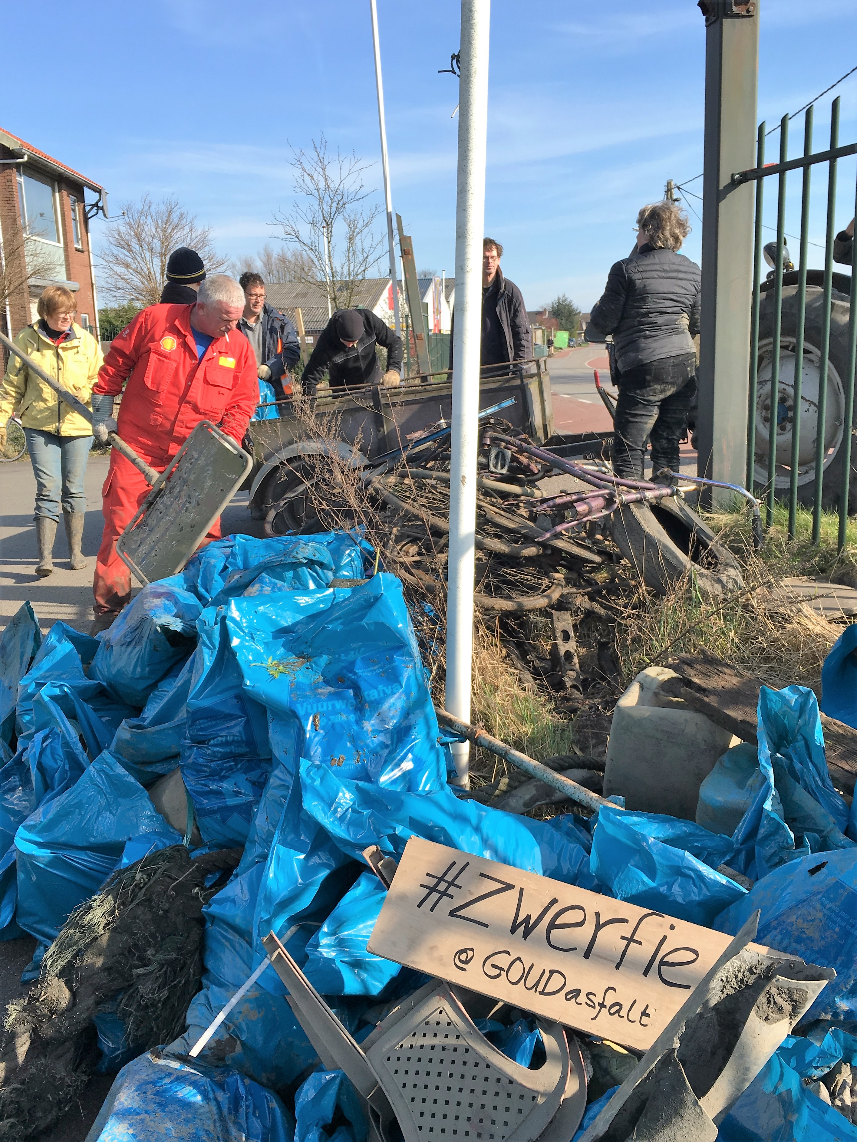 Afval_IMG_0906Op zondag 28 februari was goed te zien wat GOUDasfalt aan positiviteit en energie teweeg brengt in de stad. Zo’n 70 mensen meldden zich bij de fabriekspoort om de dijk en de oevers rondom het terrein en de wijdere omgeving schoon te maken. Dat was hard nodig. Bergen troep zijn er verzameld. Nu liggen het riet, de dijk en de waterkant er weer prachtig schoon bij. Een mooi resultaat! En we hadden met z’n allen nog een geweldig leuke dag ook. Met dank aan Kruim en Het IJsselhuis die ons spontaan hebben gevoed en gelaafd!