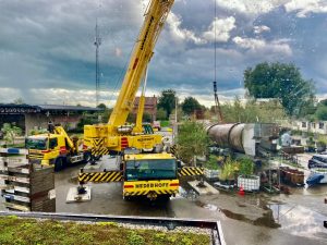 De trommel was een belangrijk en interessant onderdeel van de asfaltfabricage. “Die moet dus niet door zijn hoeven zakken, en dat zal nu ook niet meer gebeuren.” De vier nieuwe poten zijn door Jaap exact nagemaakt naar voorbeeld van de originelen en stonden klaar om zo snel mogelijk onder de trommel te lassen. Dat kon terwijl de firma Nederhoff het loeizware stuk industriële erfgoed van zo’n 25.000 kilo met hun megakraan ‘even’ 5 centimeter optilde. In anderhalf uur was de las-klus geklaard, ondanks dat het door de stromende regen meer leek op onderwaterlassen.