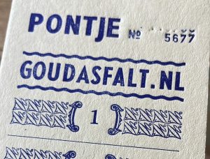 GOUDasfalt heeft een nieuwe serie strippenkaarten voor het pontje laten drukken bij de Drukkerswerkplaats in de Chocoladefabriek. Elke kaart heeft een uniek nummer en bevat 12 strippen voor een overtocht. Een losse overtocht kost €1, een 12-strippenkaart kost €10. Dus het is voordeliger én leuk om te hebben, te gebruiken of om kado te geven.