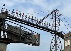 Tijdens de feestelijke viering van Gouda 750 was het veelkleurige orkest ook al van de partij hoog in de lucht op de toevoerband van De Lange Arm.